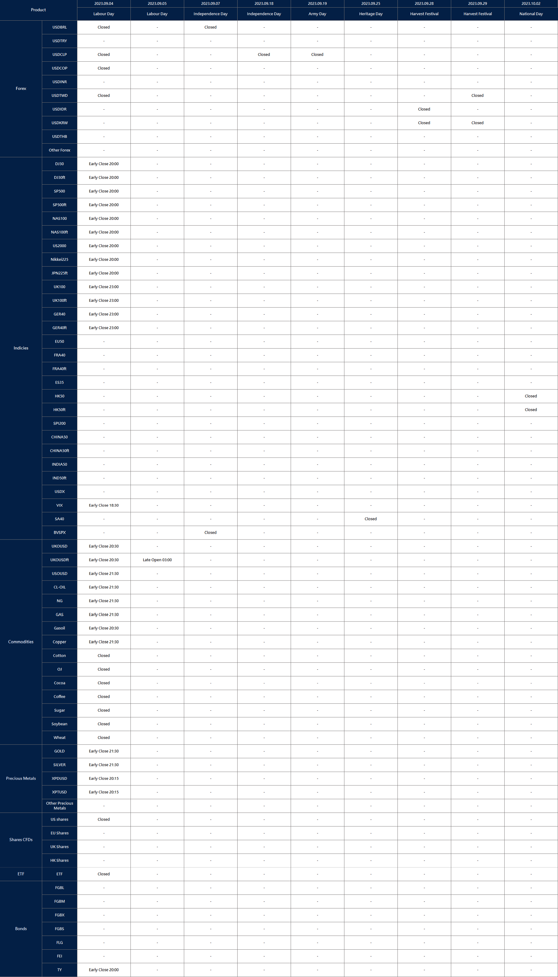 Please note that the following instruments’ trading hours will be affected by the upcoming holidays.