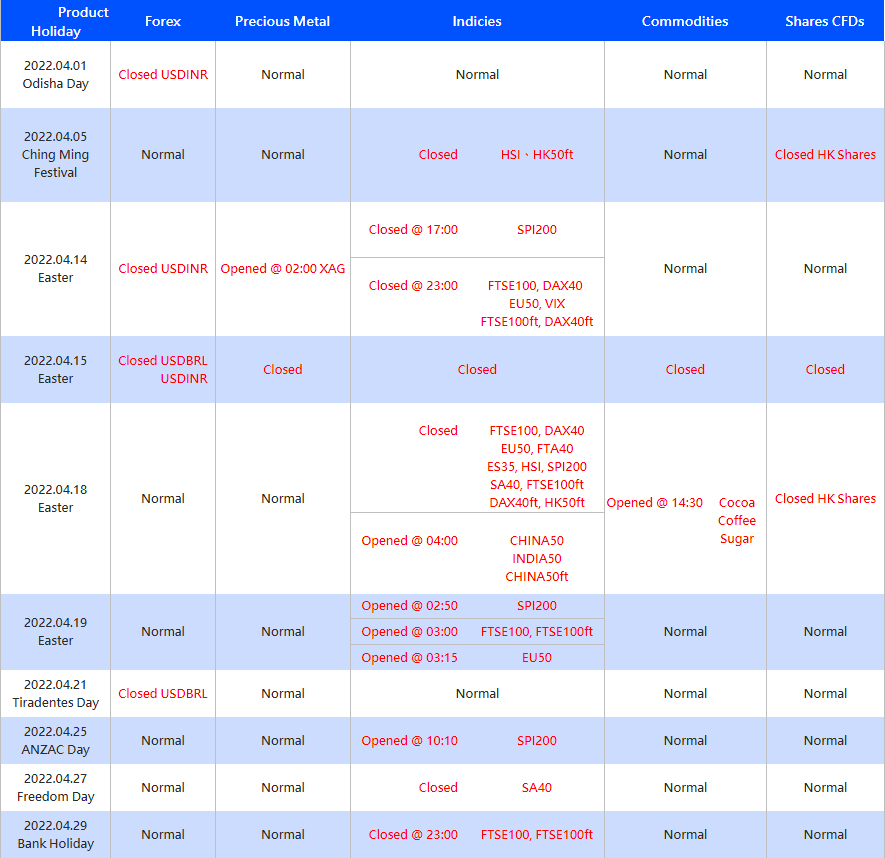 The above time is MT4/5 server time. The trading time of other products is not affected. The above data may be subject to change. Please refer to the actual time on MT4/5.