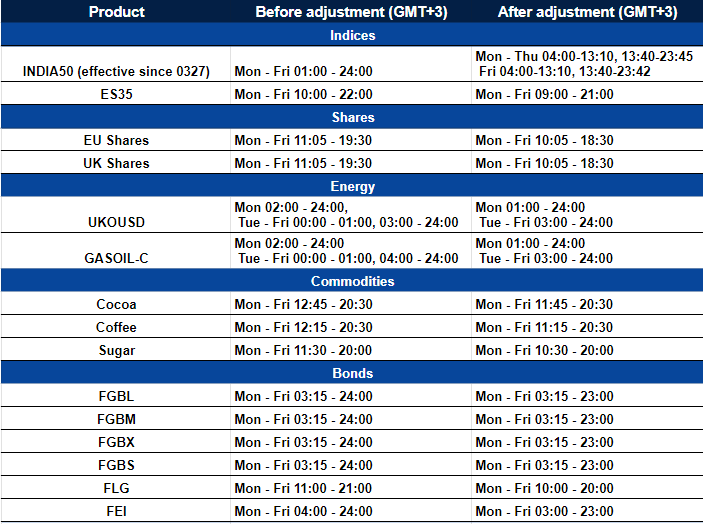 The trading hours of some products will be adjusted due to several reasons, such as DST. These adjustments will be put into effect on March 26 and 27.