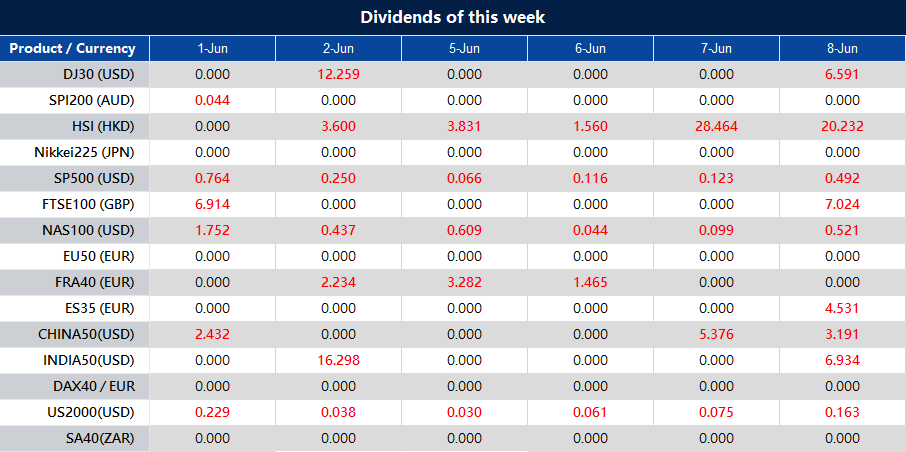 お客様各位 下記の商品につきまして、配当金が調整される予定ですのでご案内いたします。インデックス配当は、お客様の取引口座に対して残高明細を通じて個別に実行されます。コメント欄には以下の形式で記載されます: 「Div & 商品名 & 純ボリューム」 詳細は、以下の表をご参照ください。 上記のデータは参考用となります。正確な情報につきましては、MT4/MT5ソフトウェアをご参照ください。 詳しい情報が必要な場合は、 [email protected] までお問い合わせください。