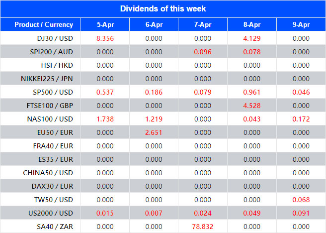 お客様各位 下記の商品につきまして、配当金が調整される予定ですのでご案内いたします。インデックス配当は、お客様の取引口座に対して残高明細を通じて個別に実行されます。コメント欄には以下の形式で記載されます: 「Div & 商品名 & 純ボリューム」 詳細は、以下の表をご参照ください。 上記のデータは参考用となります。正確な情報につきましては、MT4/MT5ソフトウェアをご参照ください。 詳しい情報が必要な場合は、 [email protected] までお問い合わせください。
