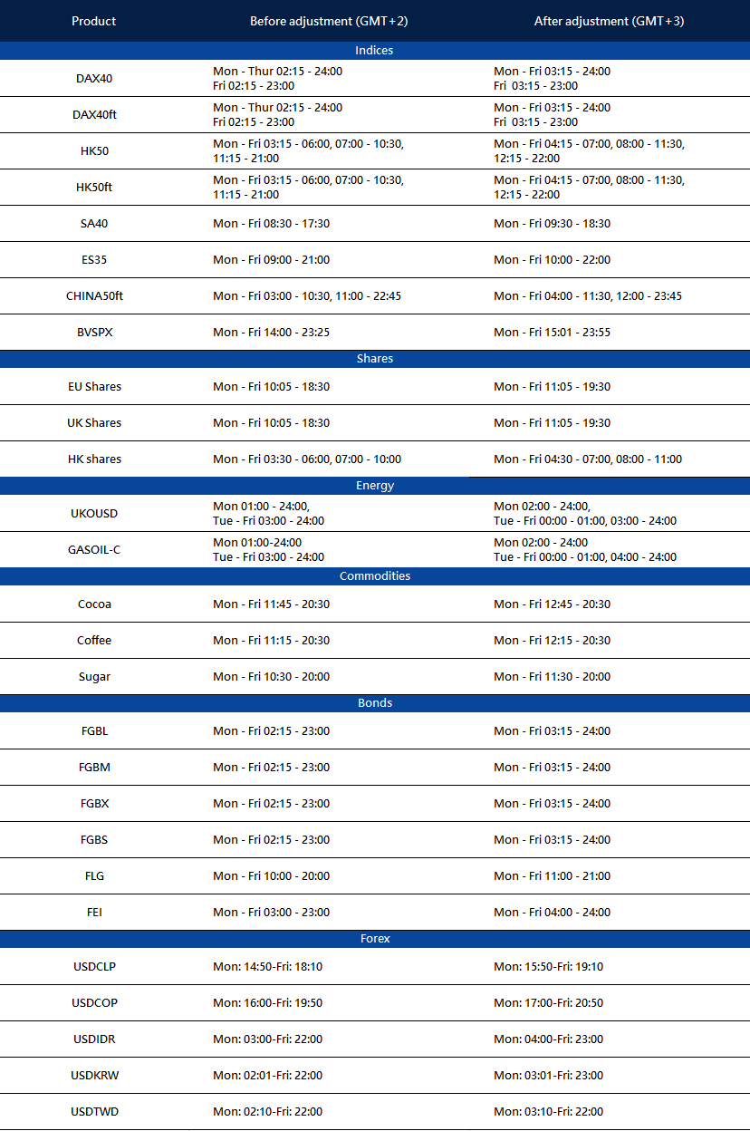 Dear Client, The trading hours of some MT4/MT5 products will change due to the upcoming Daylight-Saving Time change in US. …