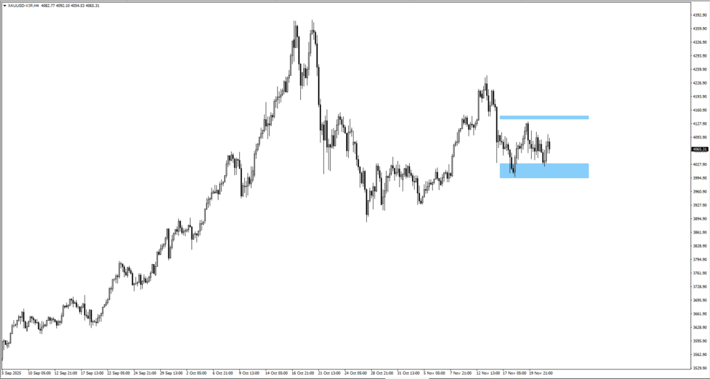 •  金は4,020ドルから反発し、3,940ドルから4,075ドルのレンジを維持した。