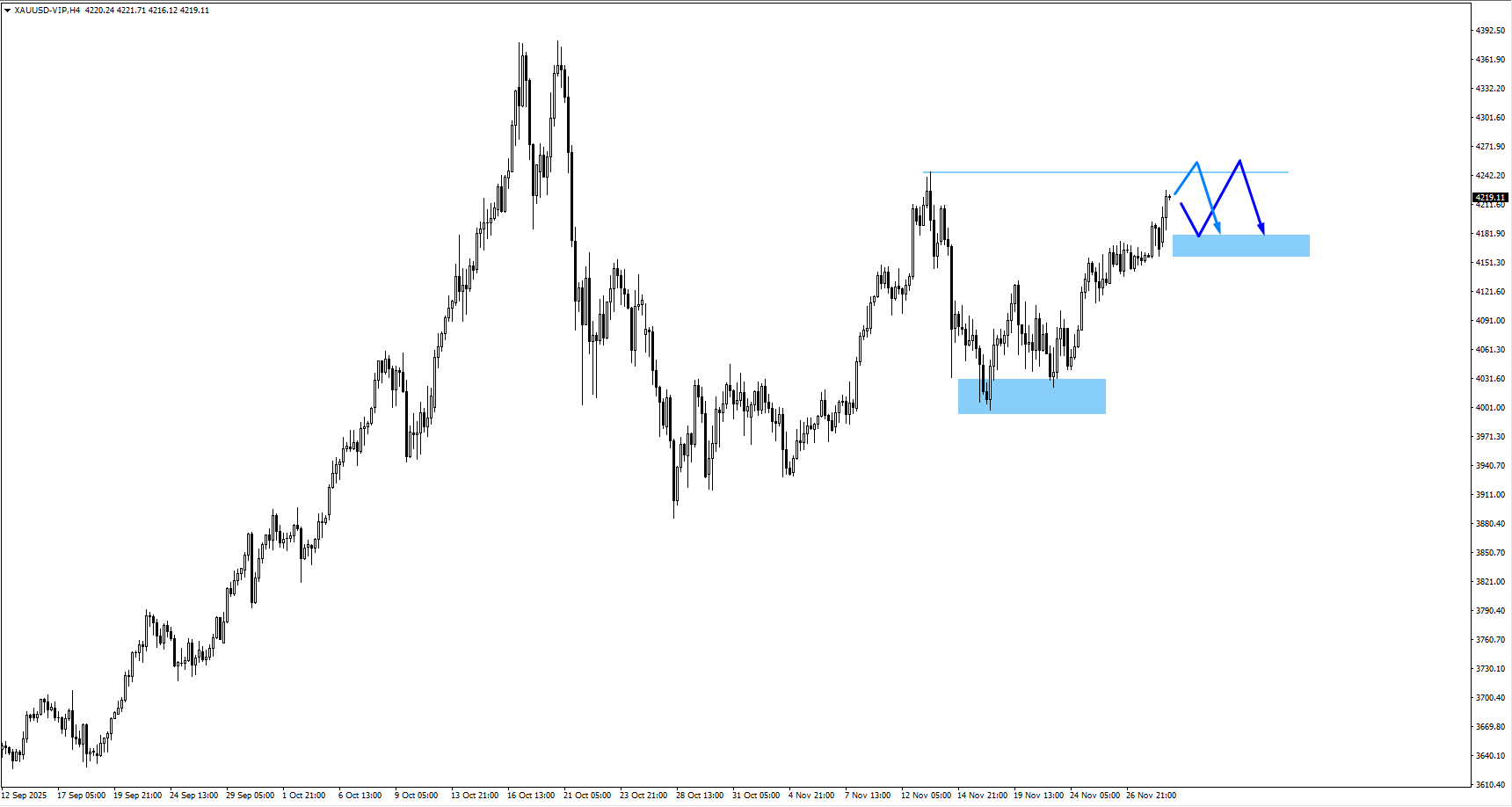 - 国債利回りの低下と12月のFRB利下げ期待の高まりを背景に、金は監視エリアの4,190を上回って取引された。